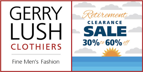 Gerry Lush Clothiers would like to make your shopping experience for fine menswear in Burlington as convenient and informative as possible. We invite you to register for the GLC Newsletter, which will keep you up to date on the latest seasonal trends in men’s fashion, new arrivals and special events at the store.